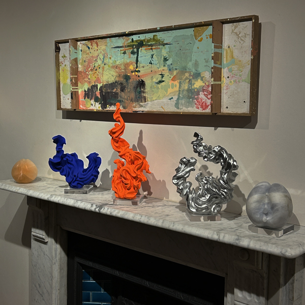 Two Peaches & Creams and three new clay studies below one of Loukas Morley’s drip tray paintings